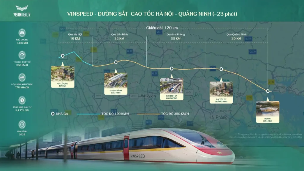 Vinspeed Hà Nội là tuyến đường sắt cao tốc do Vingroup đầu tư và phát triển. Dự án kết nối trực tiếp từ ga Cổ Loa đến Hạ Long Xanh. Tuyến đường rút ngắn thời gian di chuyển giữa Hà Nội và Quảng Ninh. Đây là lợi thế lớn cho Vinhomes Hạ Long Xanh trong việc thu hút cư dân và nhà đầu tư. Hạ tầng Vinspeed Hà Nội tạo cú hích tăng trưởng cho bất động sản khu vực.